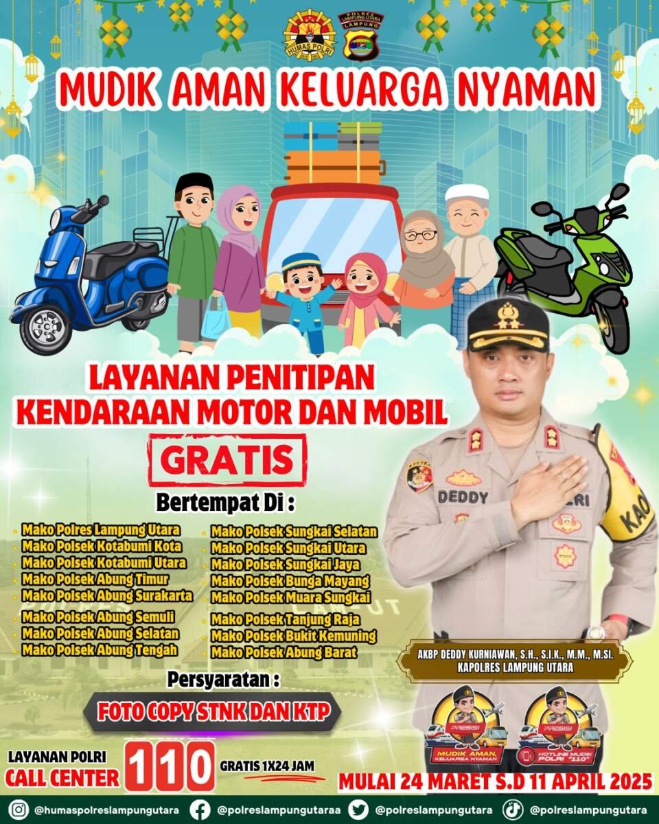Lampung Utara – Menjelang mudik Lebaran Idul Fitri 2025, Polres Lampung Utara membuka layanan penitipan kendaraan gratis bagi masyarakat yang ingin meninggalkan kendaraan mereka